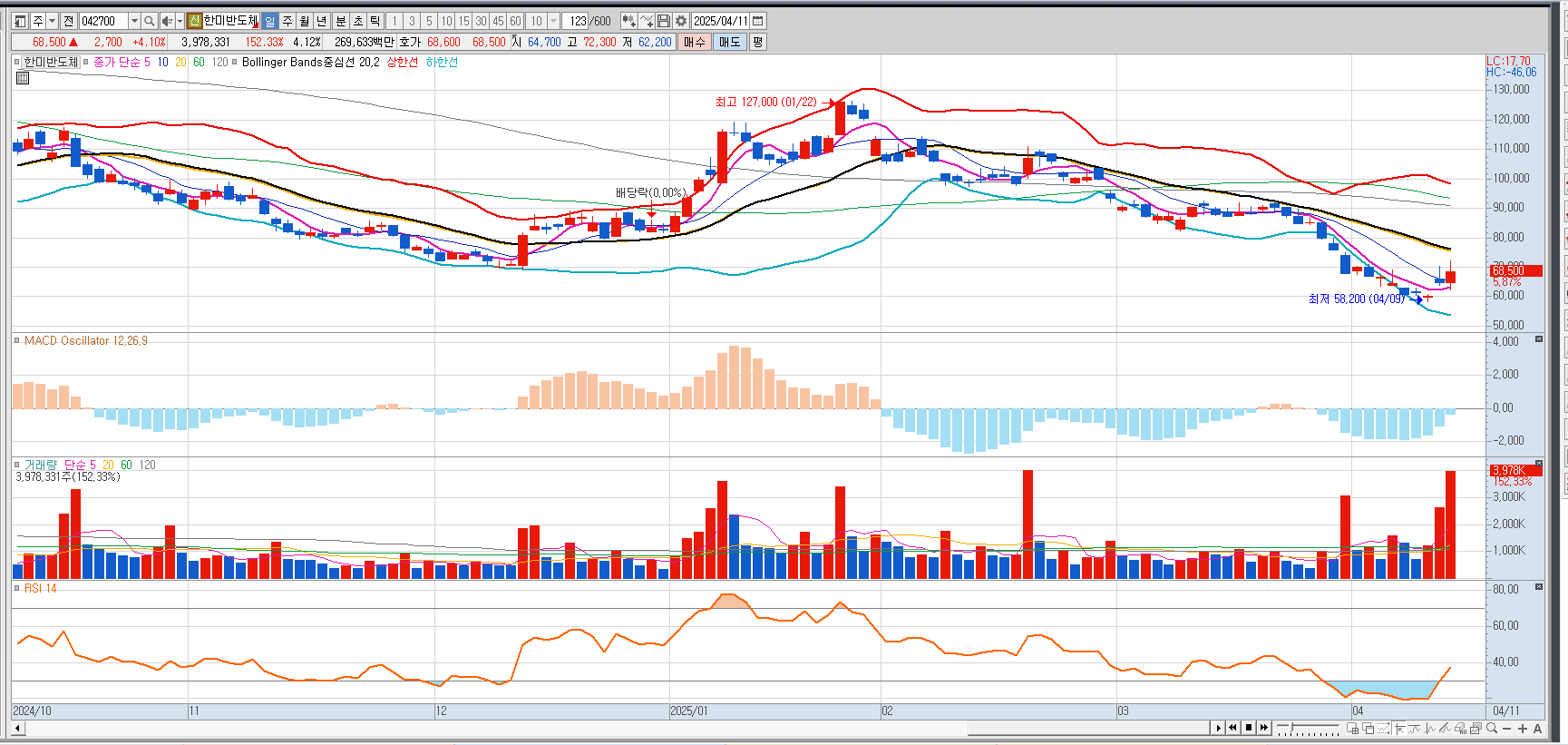 아래는 한미반도체(042700)의 일봉 차트를 기반으로 한 기술적 분석입니다. 분석 시점은 2025년 4월 11일 기준입니다.