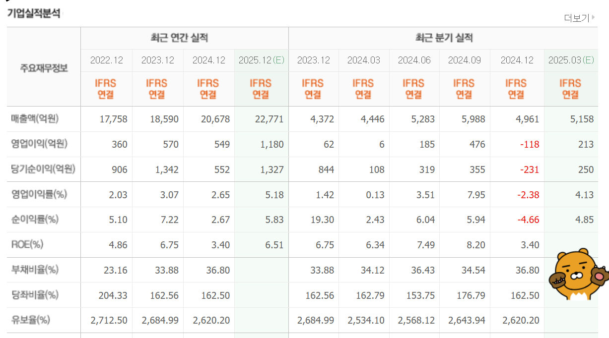 | 당기순이익 | 355억 | -231억 | 250억 | 2024년 4분기 큰 손실, 이후 반등 예상 |