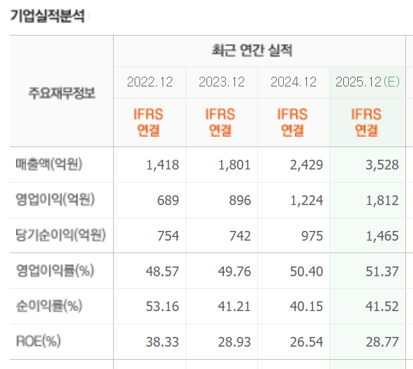 * 2025년에는 매출액, 영업이익, 순이익이 급등할 것으로 예상이 됩니다. 영업이익률과 순이익률도 아주 좋은 것을 알 수 있습니다. 전체적으로 우상향하는 많지 않은 기업 중의 하나입니다. 단기 조정을 마치고 상승을 유지해 갈지, 하락을 더 하고 상승할지 지켜볼 필요가 있습니다.