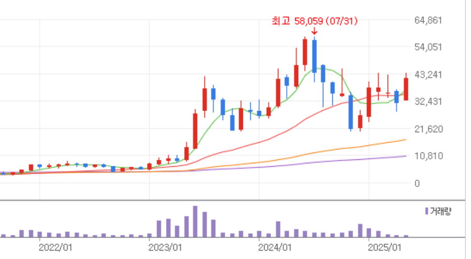 * 2005년도에는 영업이익과 당기순이익이 2배 정도 증가할 것으로 예상이됩니다. 실적이 급증할 것으로 예상하기 때문에 그에 따라서 주가도 상승할 수 있을 것 같습니다. 아래는 이수페타시스의 월봉차트 입니다. 단기적으로 많이 올랐습니다. 이전 고점을 돌파하고 최고점을 향해서 갈지 아니면 조금 더 횡보를 하다가 전고점을 향해서 갈지 추이를 지켜볼 필요가 있습니다.
